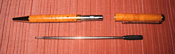 ・次に、先のついている木軸の上部のパイプを回し上記のように外します、この時、分かれる付け根部分を持ち回して下さい、「回すと芯が出る部分」を持ち回すと取れにくく部品を傷める可能性があります。 |